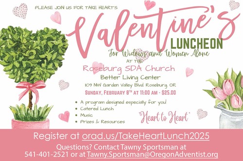 Register online at orad.us/TakeHeartLunch2025. If you don’t do online registration, or if you have questions, call or email Tawny Sportsman at 541/401-2521 or Tawny.Sportsman@oregonadventist.org.