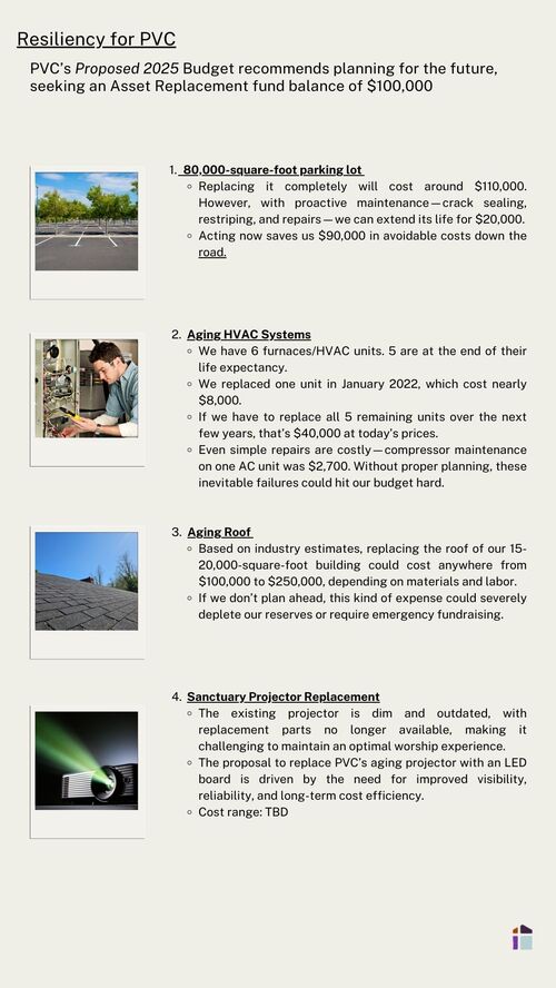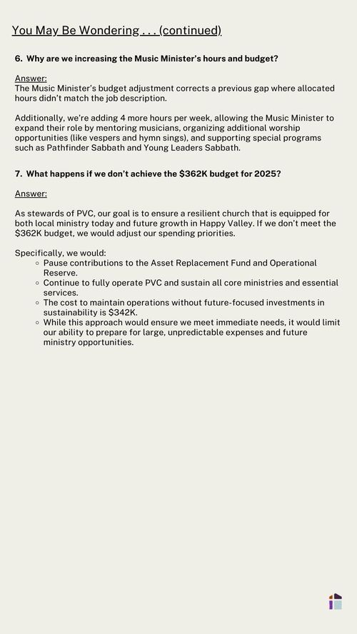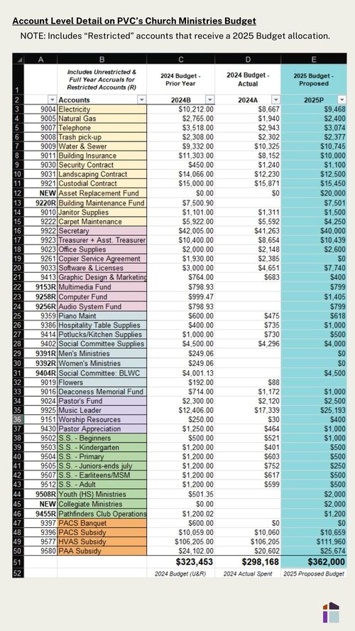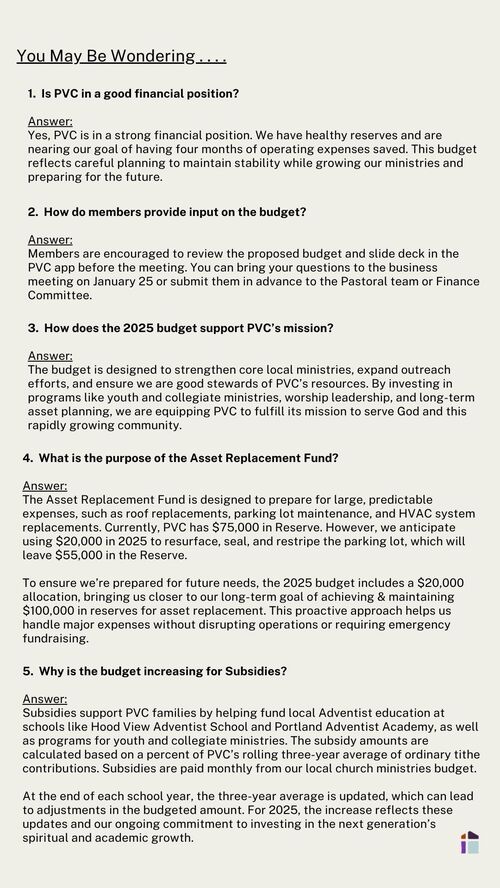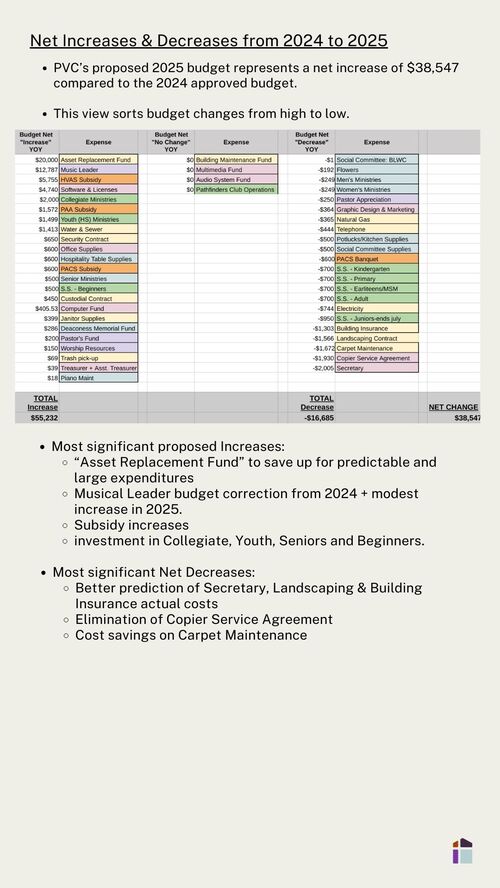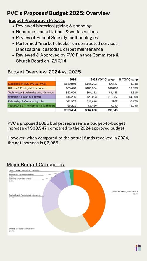As we approach the final step in the 2025 budget process, we want to express gratitude for the faithfulness and generosity that make possible everything at PVC. Over the past four months the pastoral team, Finance Committee, and Church Board have worked prayerfully and carefully to create the proposed budget for 2025. Now it's time for the members to make the final decision.