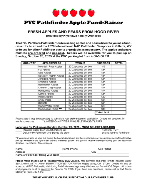 Our Pathfinders are selling apples and pears from Kiyokawa Family Orchards once again. To order, just fill out an order form (copies in the church lobby) and drop it off at the church office along with payment during open hours or bring it to our Pathfinder meeting on Wednesday night from 6:30 to 8:30 PM. Another option for PVC members would be to call/text Aileen Stanley at 503/780-1470 and let me know the variety and quantities that you wish to purchase. You could mail a check to PVC before October 15, 2025 or pay when you pick up. Thank you for supporting our attendance at the International Pathfinder Camporee in 2029 and Pathfinder Bible Experience.